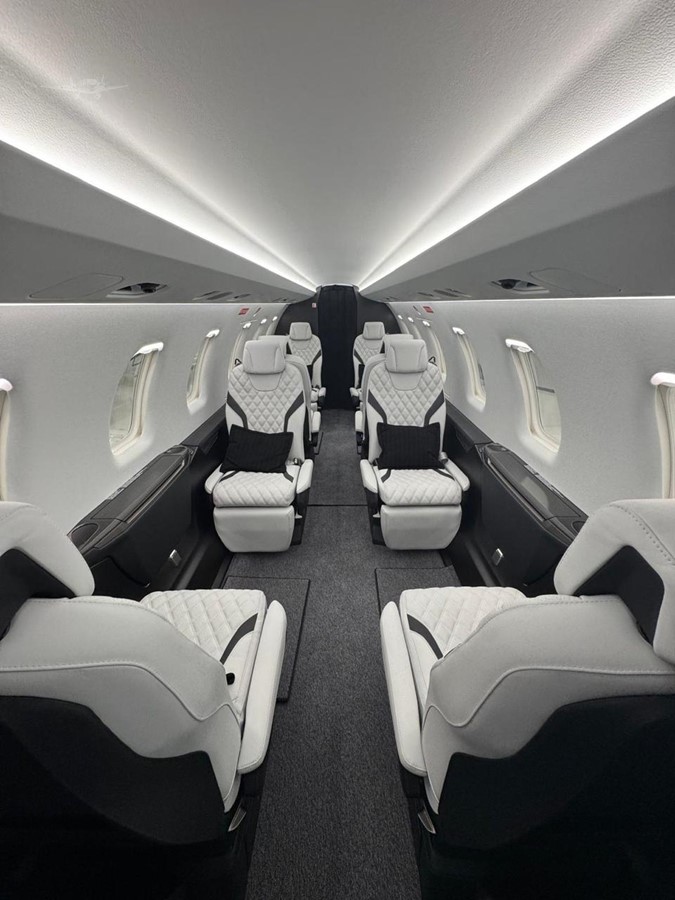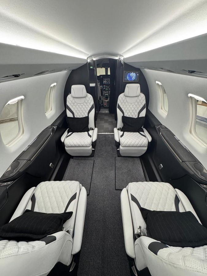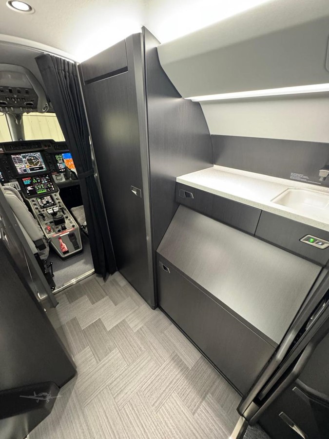8-passenger executive interior. Forward galley and lavatory, 4-place club forward, 4-place club aft. Aft baggage compartment. Integrated cabin management system.